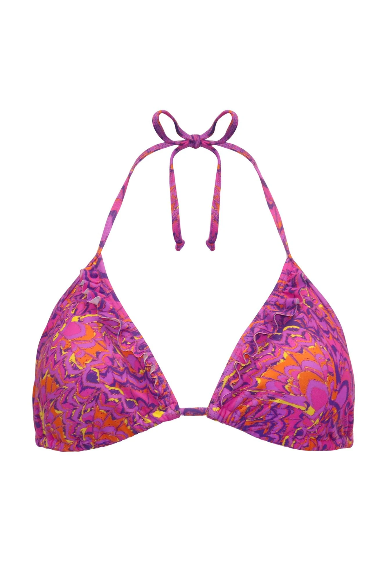 Achieve poolside glamour in the Bermuda Non-Wired Triangle Top. In a flattering halter neck style, you’ll still feel completely supported in this non-wired bikini top. Decorated beautifully in frill detailing and bold butterfly print, what more could you want from this playful and feminine bikini top. This gorgeous bikini top that is inspired by the famous pink sand beaches of Bermuda looks fabulous when paired with bikini bottoms from the collection. We take the impact that our business has on the planet seriously that is why the Bermuda Non-Wired Triangle Top is made from recycled materials.