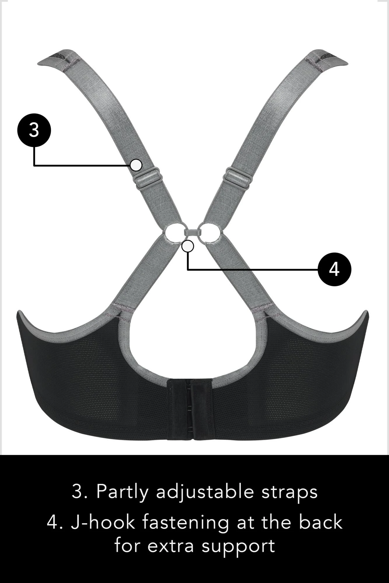 - J-hook fastening at the back for extra support, allowing you to convert to a racer back