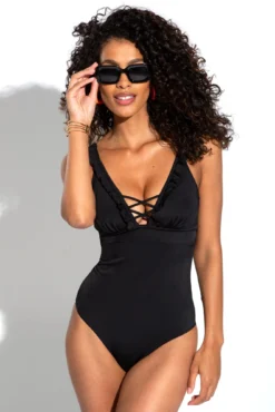 Add a feminine touch to your swimwear with the Frill Lace Up Control Swimsuit. With pretty pleated frills along the neckline and a cheeky lace up detailing, this swimsuit is anything but plain. With moulded cups and partly adjustable straps, this non wired swimsuit will have you chasing the sun.