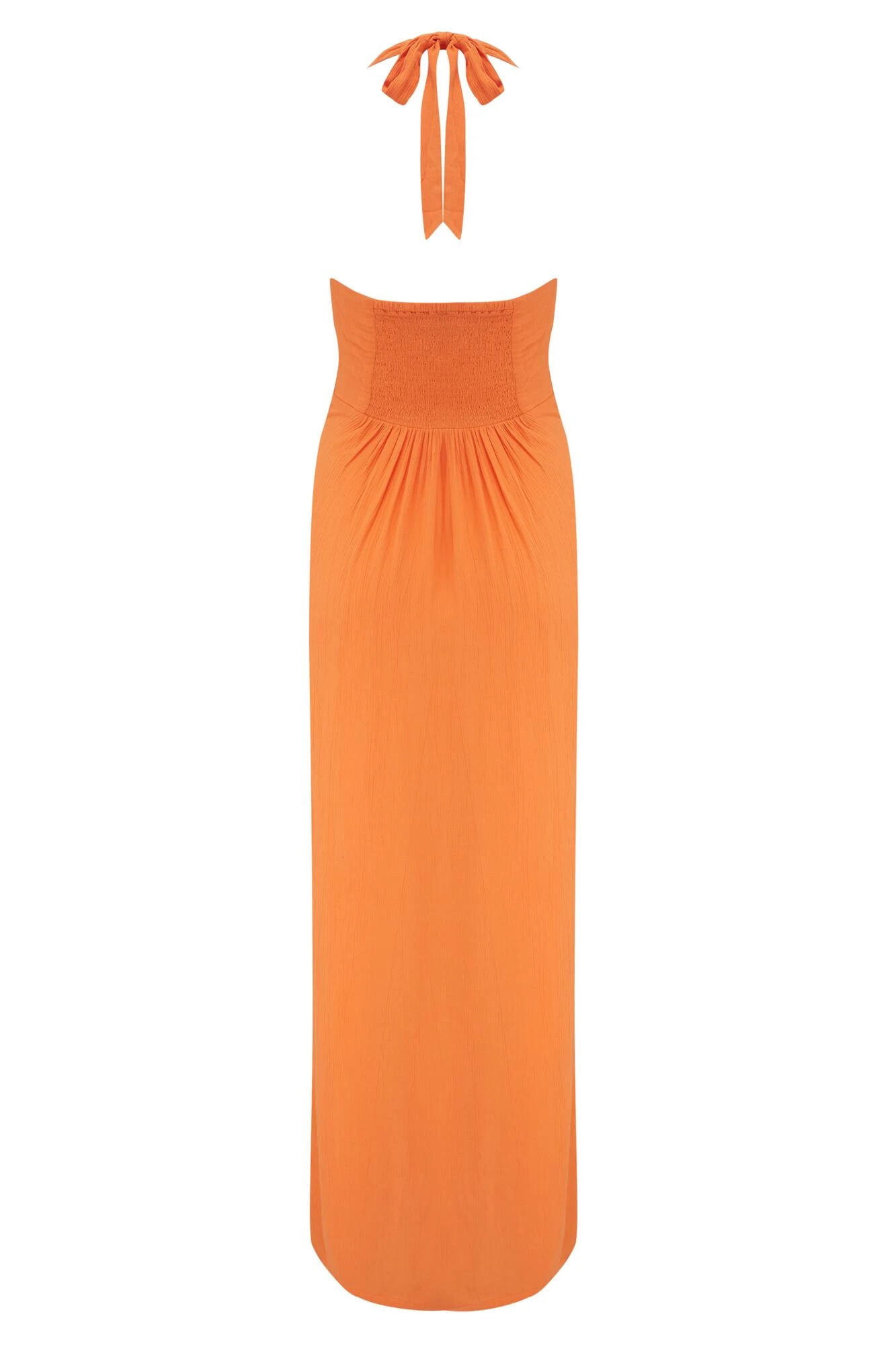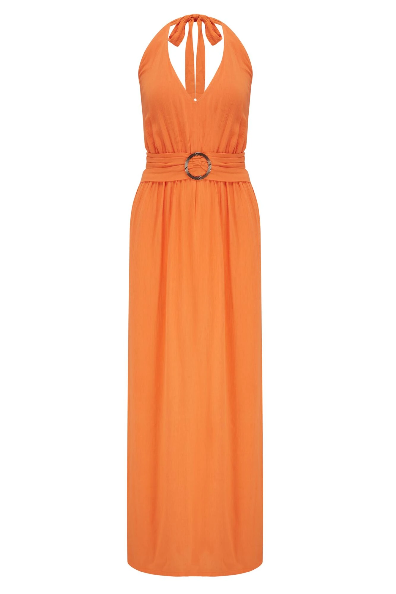 Hit refresh on your summer wardrobe with this maxi dress. Taking you straight from beach to bar, this comfortable maxi dress with crinkle fabric detailing features a halter neck design, sultry leg splits and gold buckle hardware detailing at the waist. For the perfect beach-ready look throw this stylish maxi dress over swimwear from the Santa Cruz collection.